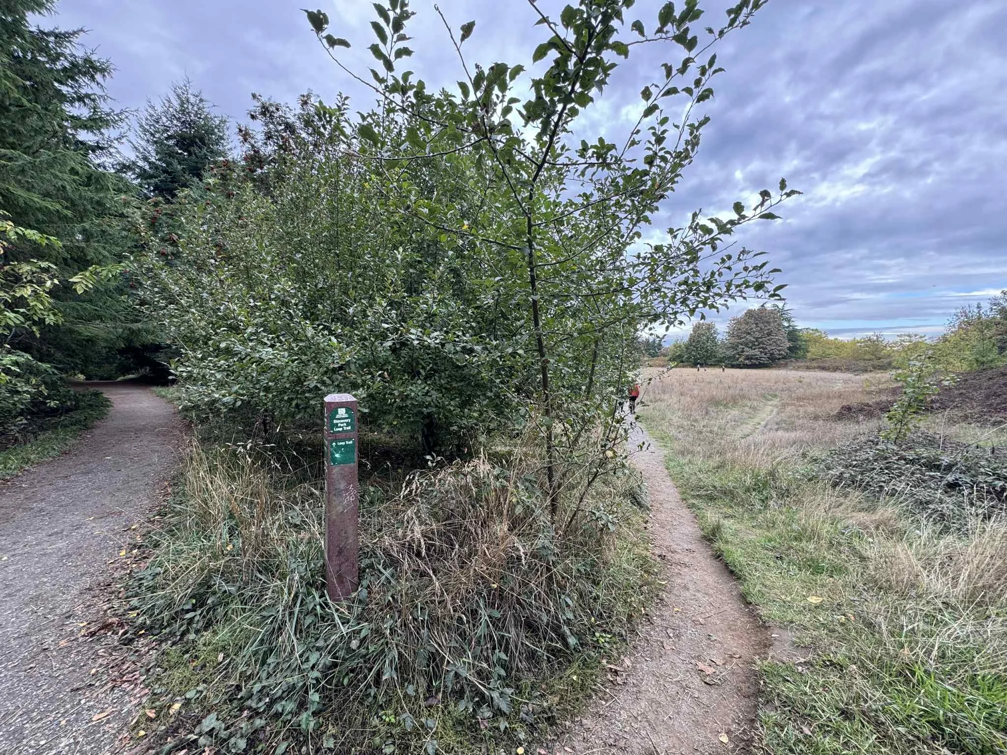 You’re on the right path! Keep walking until you spot a short wooden fence post standing guard by the trail.